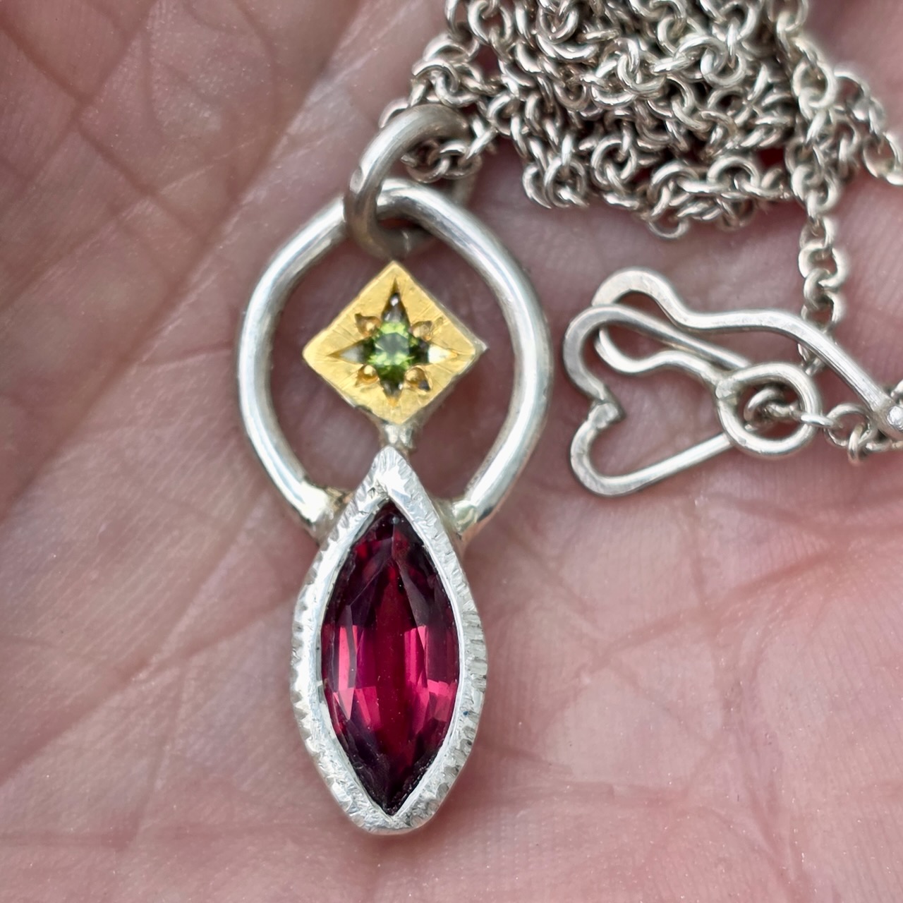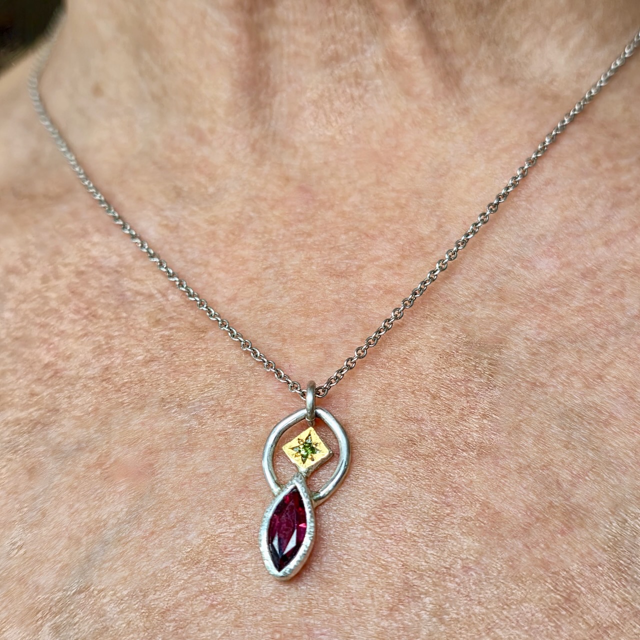 Balancing act necklace; 12x5mm rhodolite garnet, unheated sapphire, silver and 24ct gold. Length 46.5cm