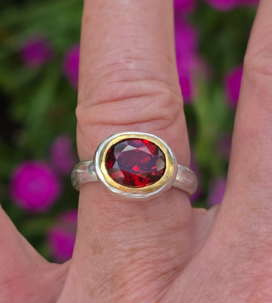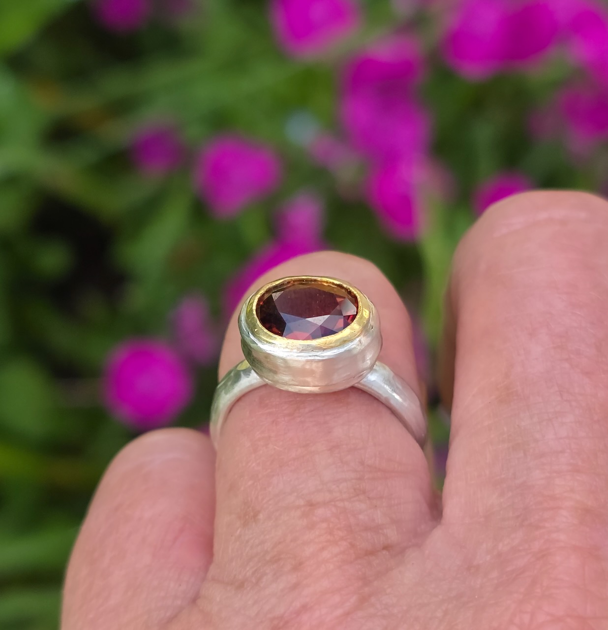 Contessa Ring; 10x8mm African garnet, silver and 24ct gold. Size P