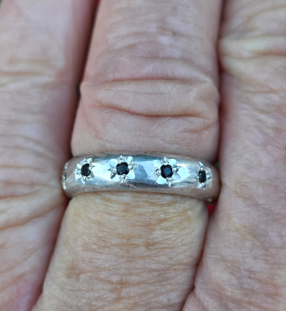 Dahlia ring; half round sterling silver, flower set black spinels. Size M1/2
