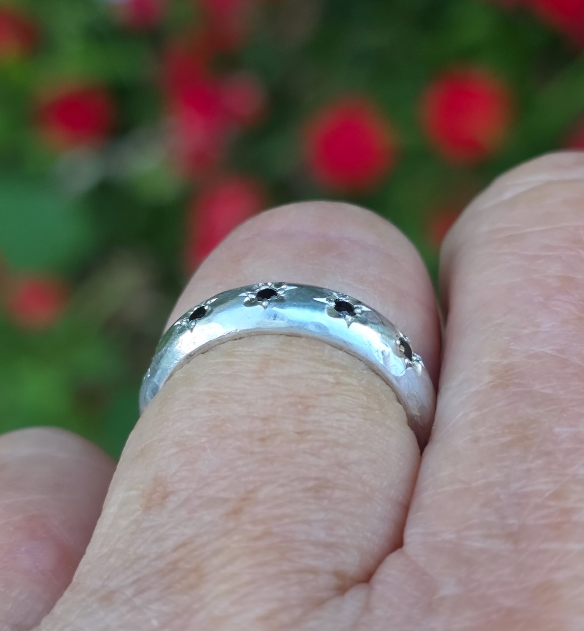 Dahlia ring; half round sterling silver, flower set black spinels. Size M1/2 quantity