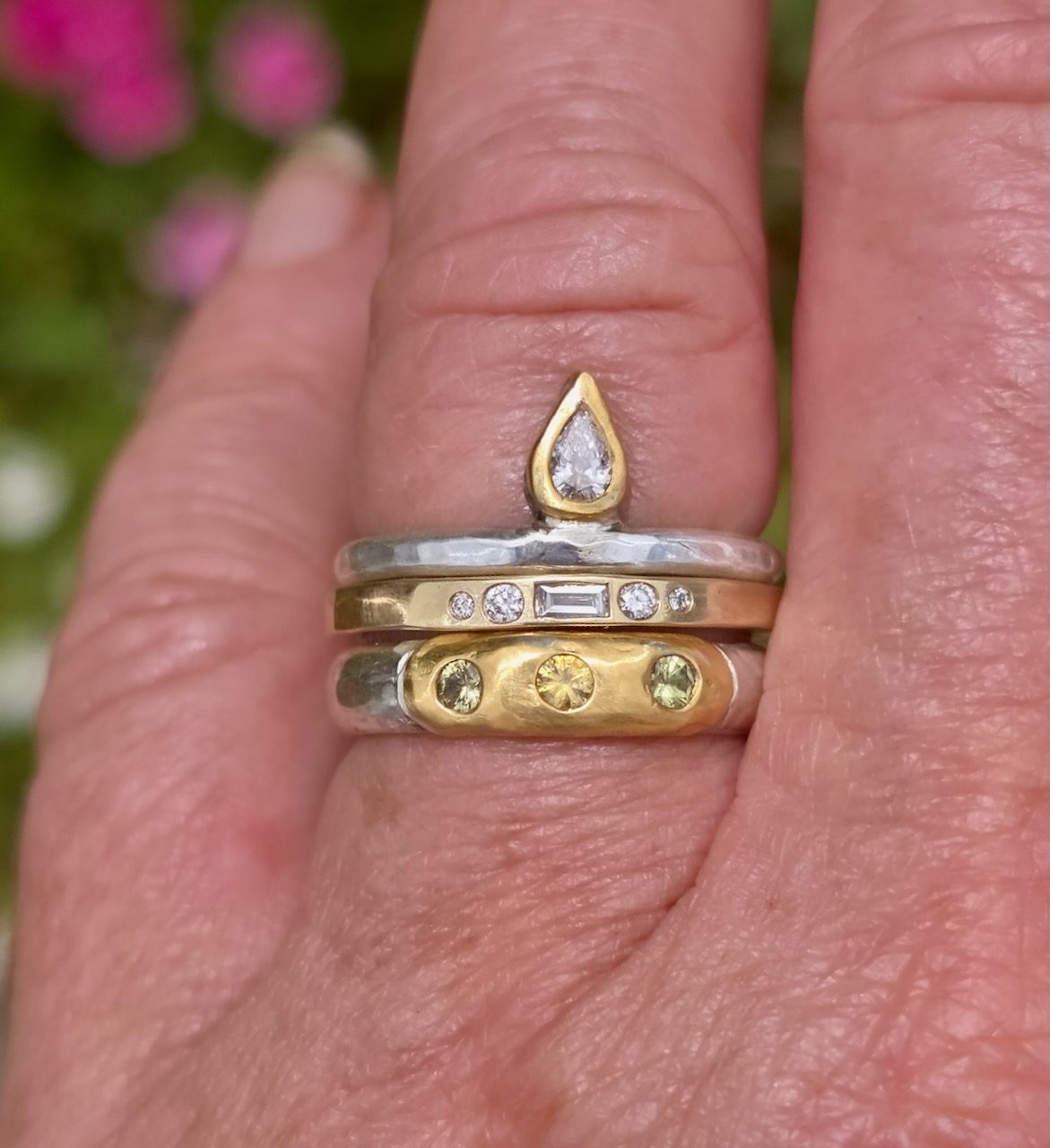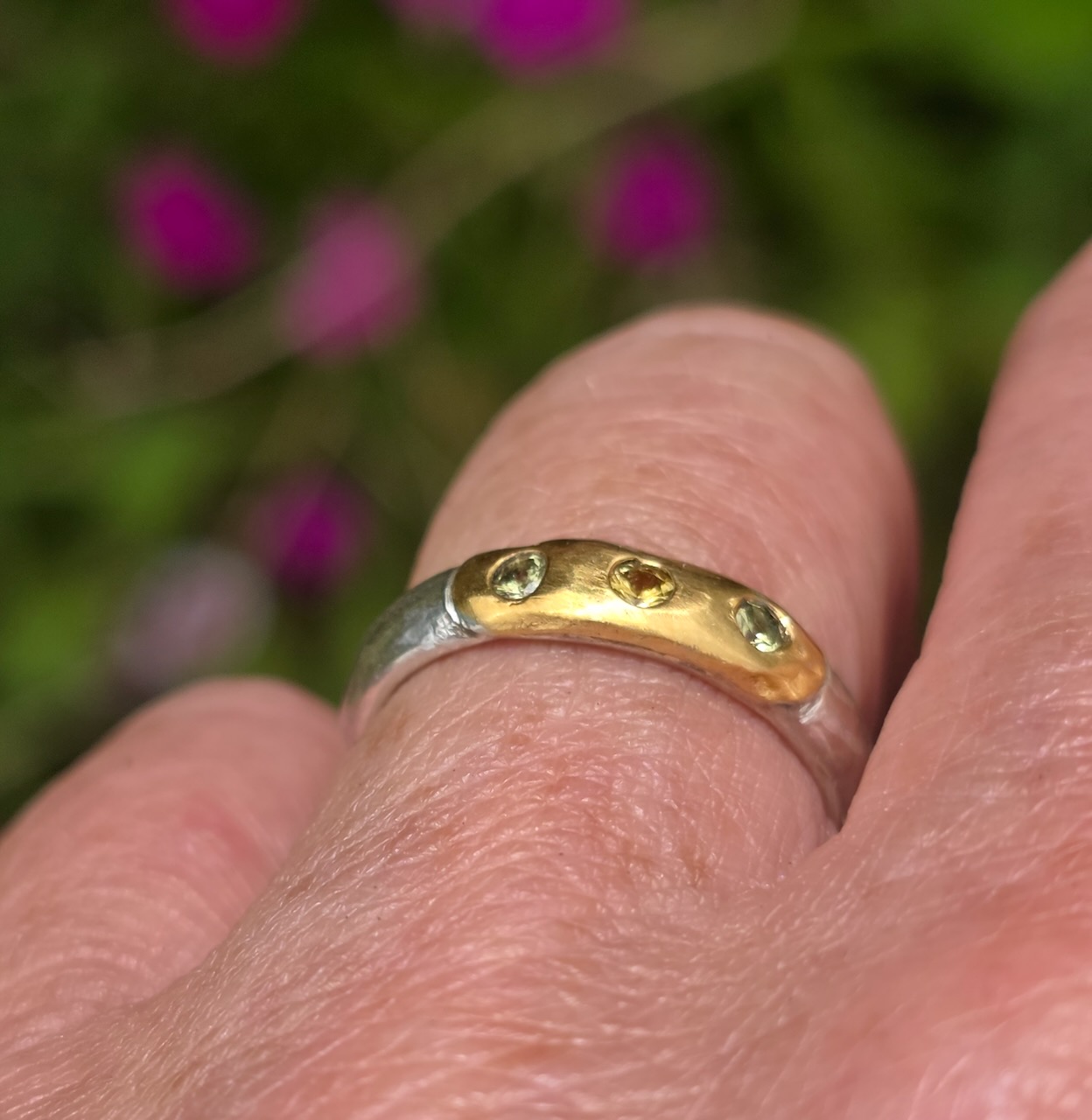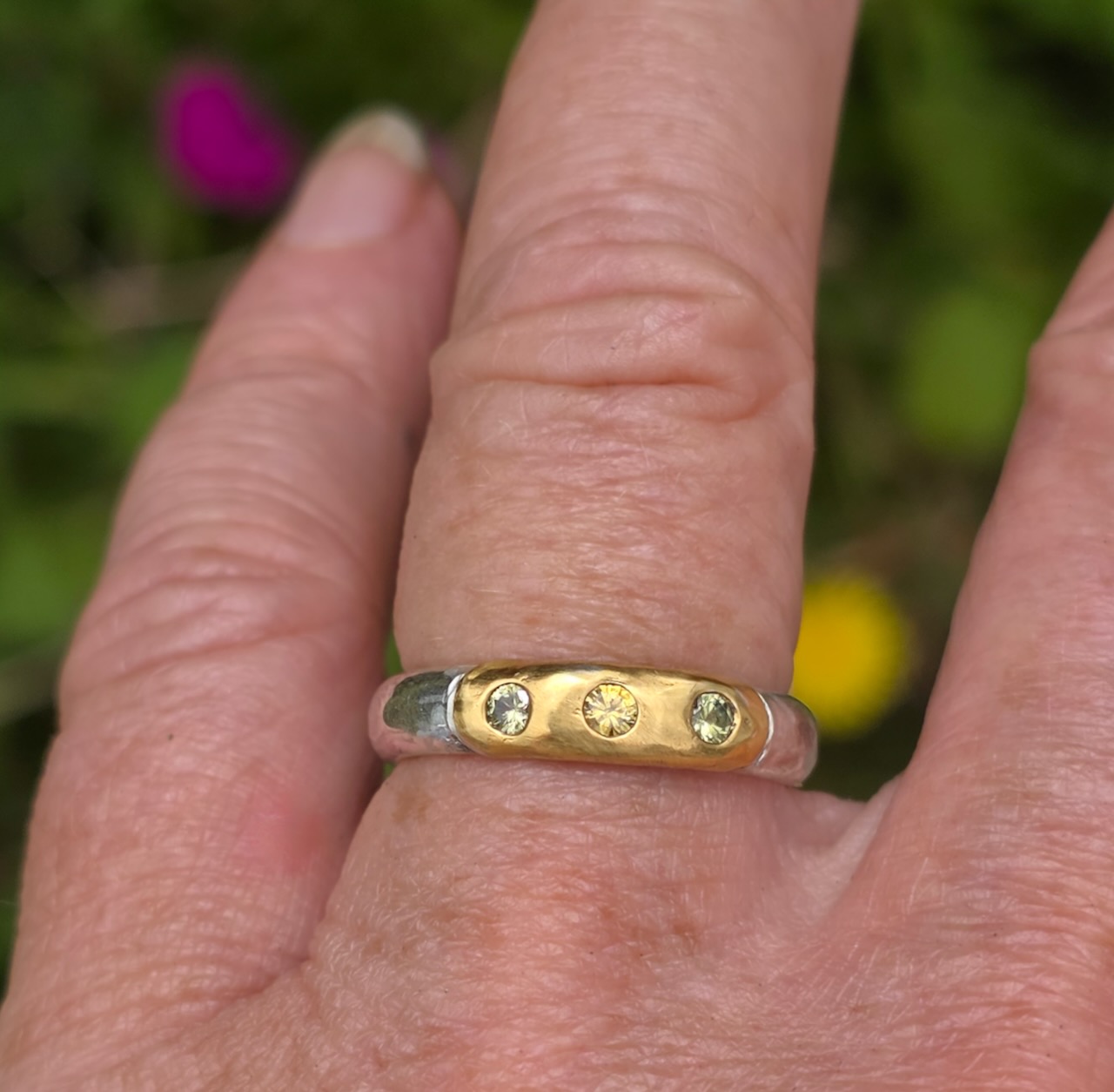 Eclipse Ring; 24ct gold, silver, unheated green and yellow sapphires. Size O