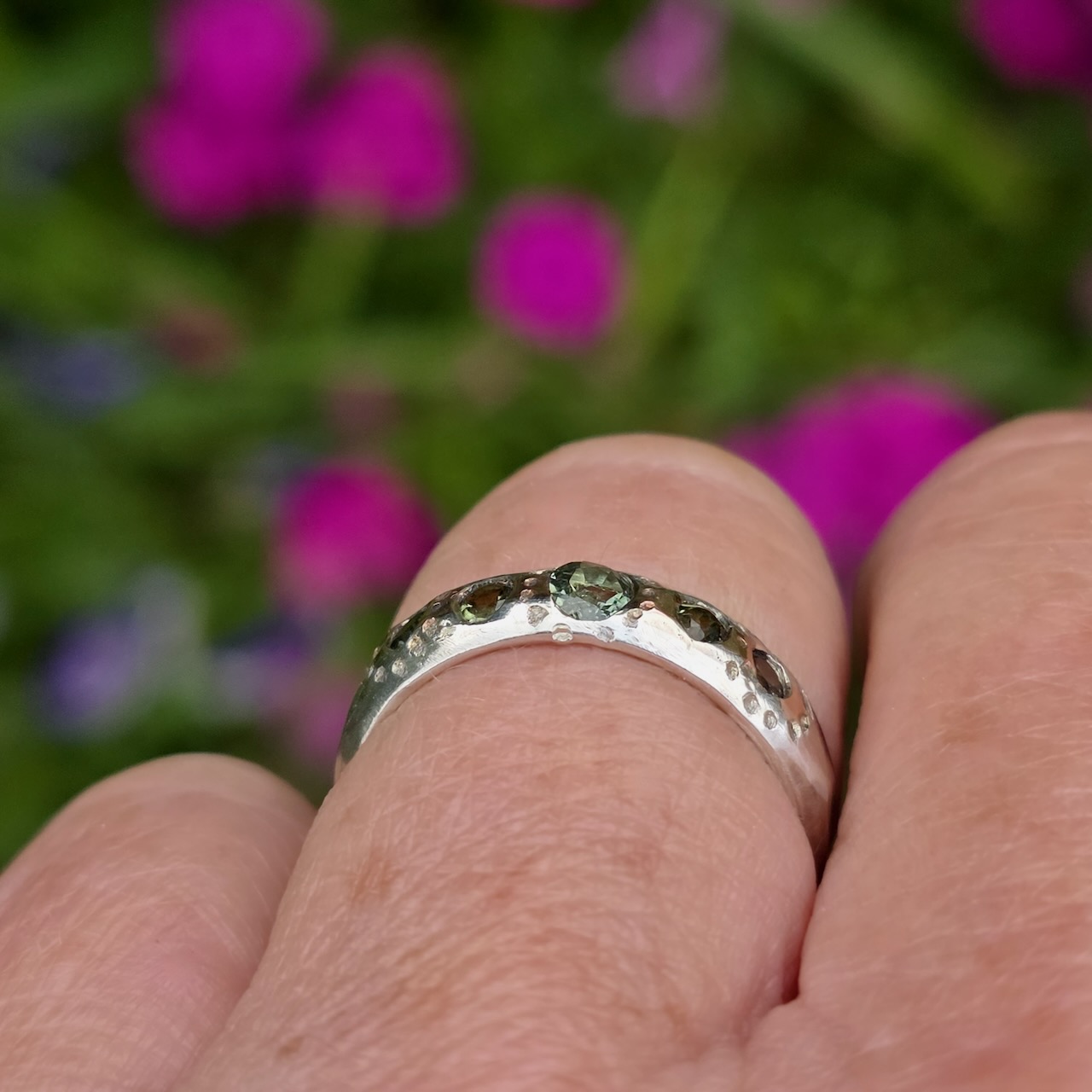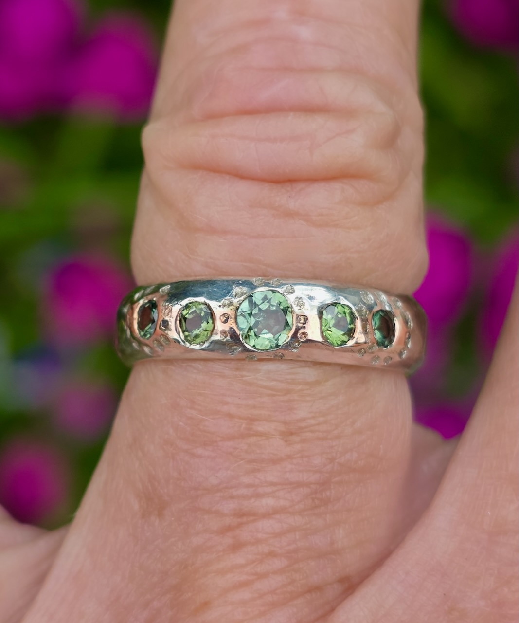 Eclipse ring; silver, 9ct rose gold. Untreated ethical Australian green sapphires. Size M quantity
