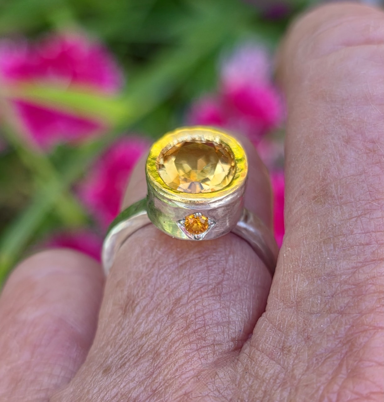 Empress Ring; 11mm x 9mm citrine, orange sapphires, 24ct gold and silver. Size P 1/2 quantity