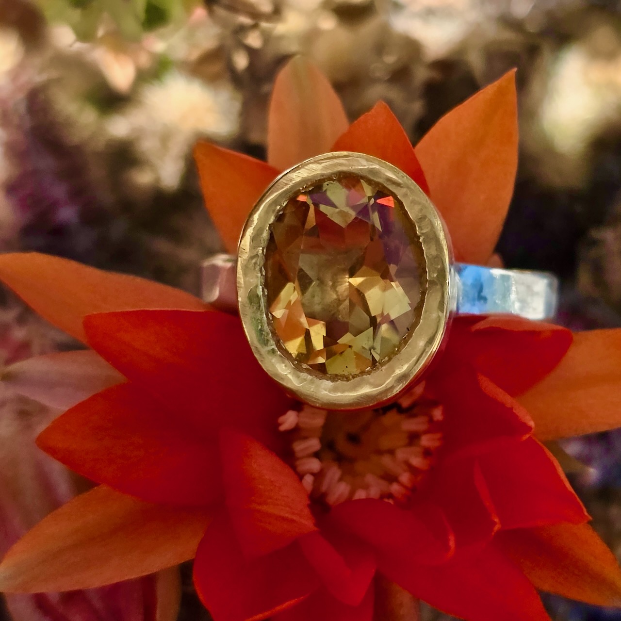 Chloris Ring; danburite and unheated sapphires. Silver and 24ct gold, size N 1/2
