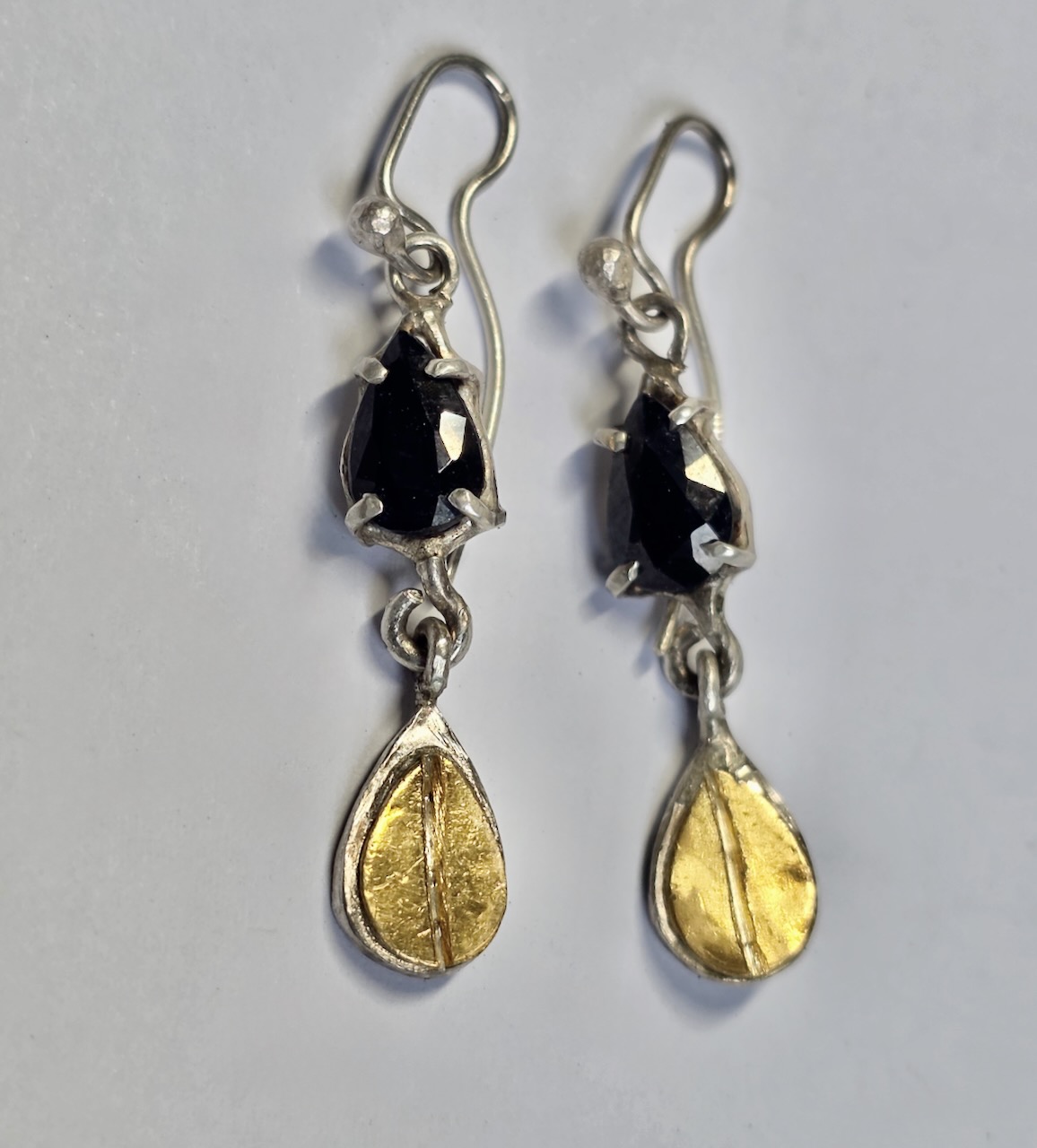 / Forest Nymph earrings; black sapphire pear, silver and 24ct
