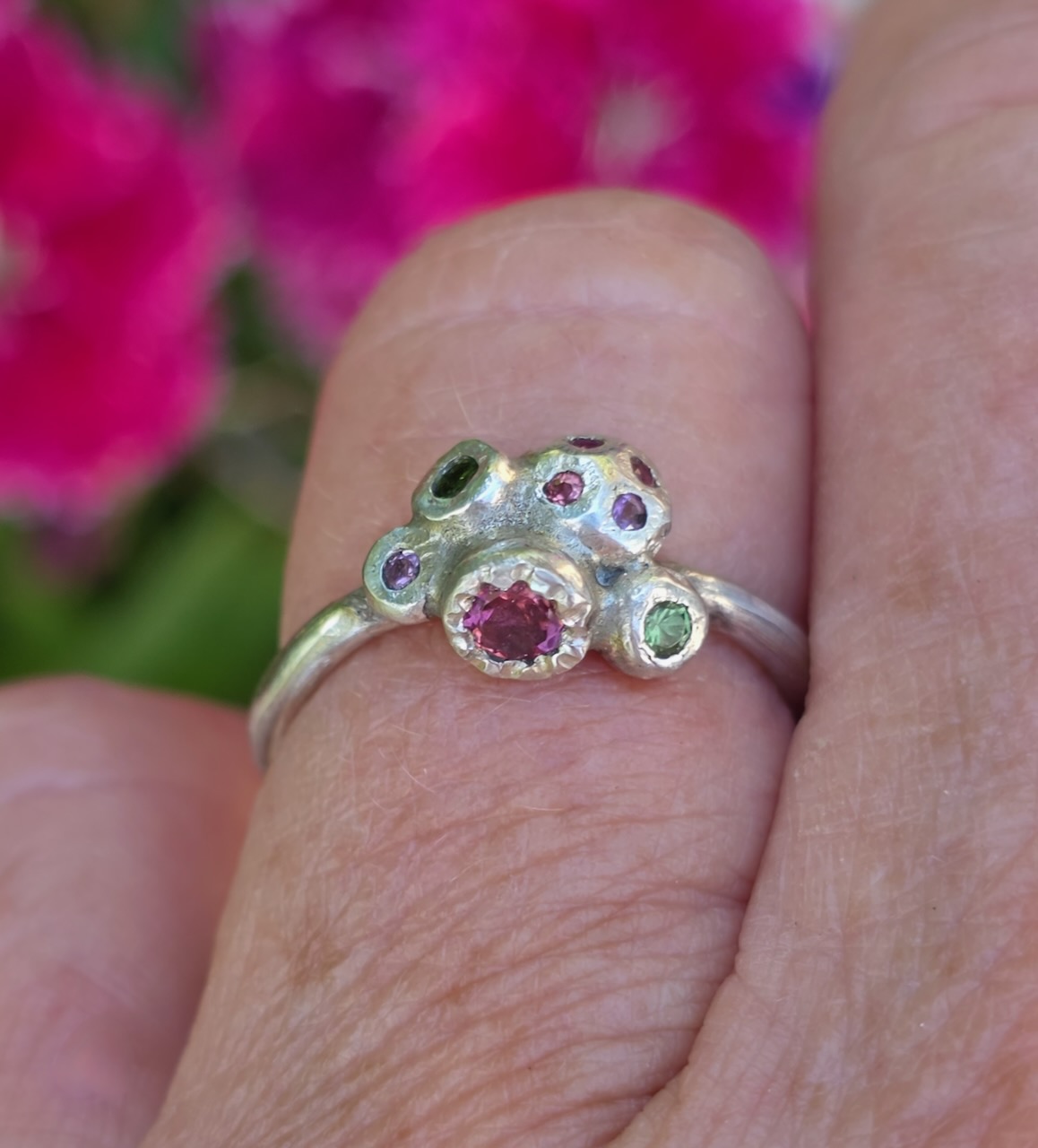 Lovers Knot ring; tourmaline, sapphires, tsavorite garnet, silver. Size N