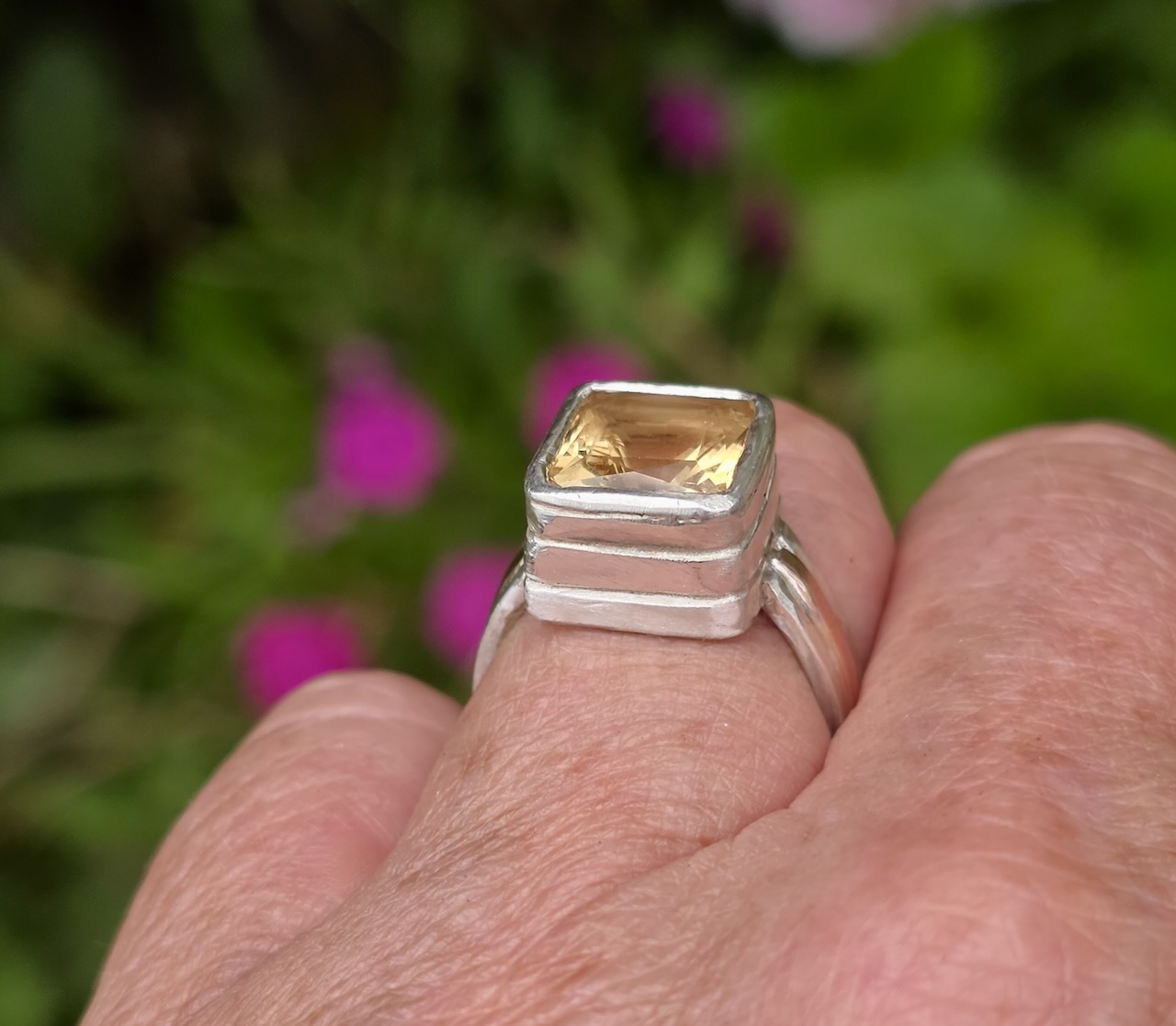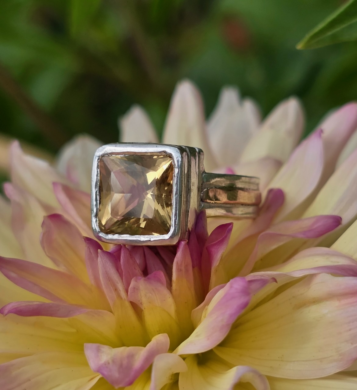 Medieval ring; 9mm princess citrine, silver and 9ct red gold. Size M.