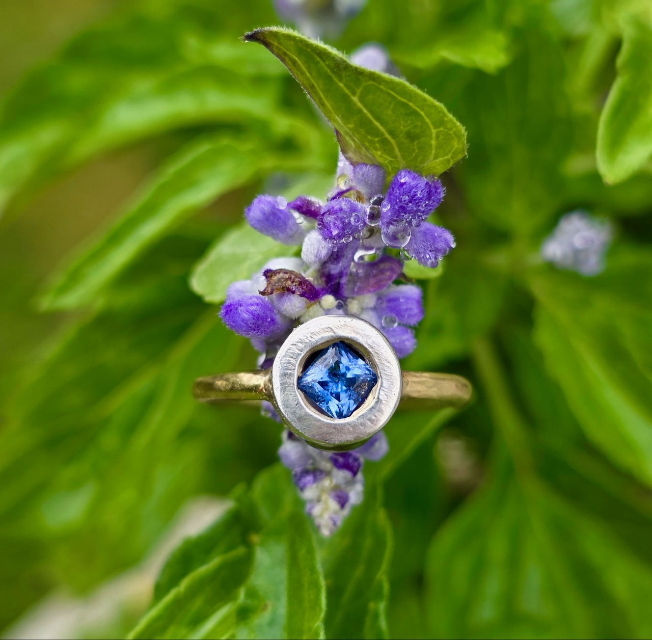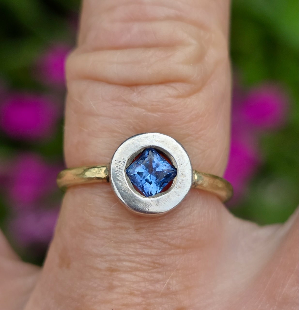 Florette ring; 7.5mm gold tourmaline, native cut sapphires, 24ct, 18ct white gold and silver. Size Q