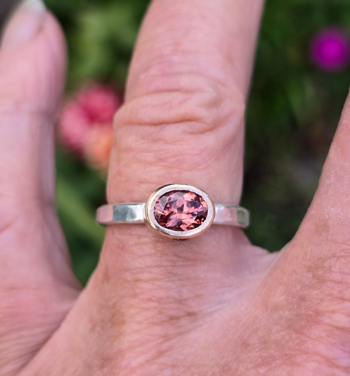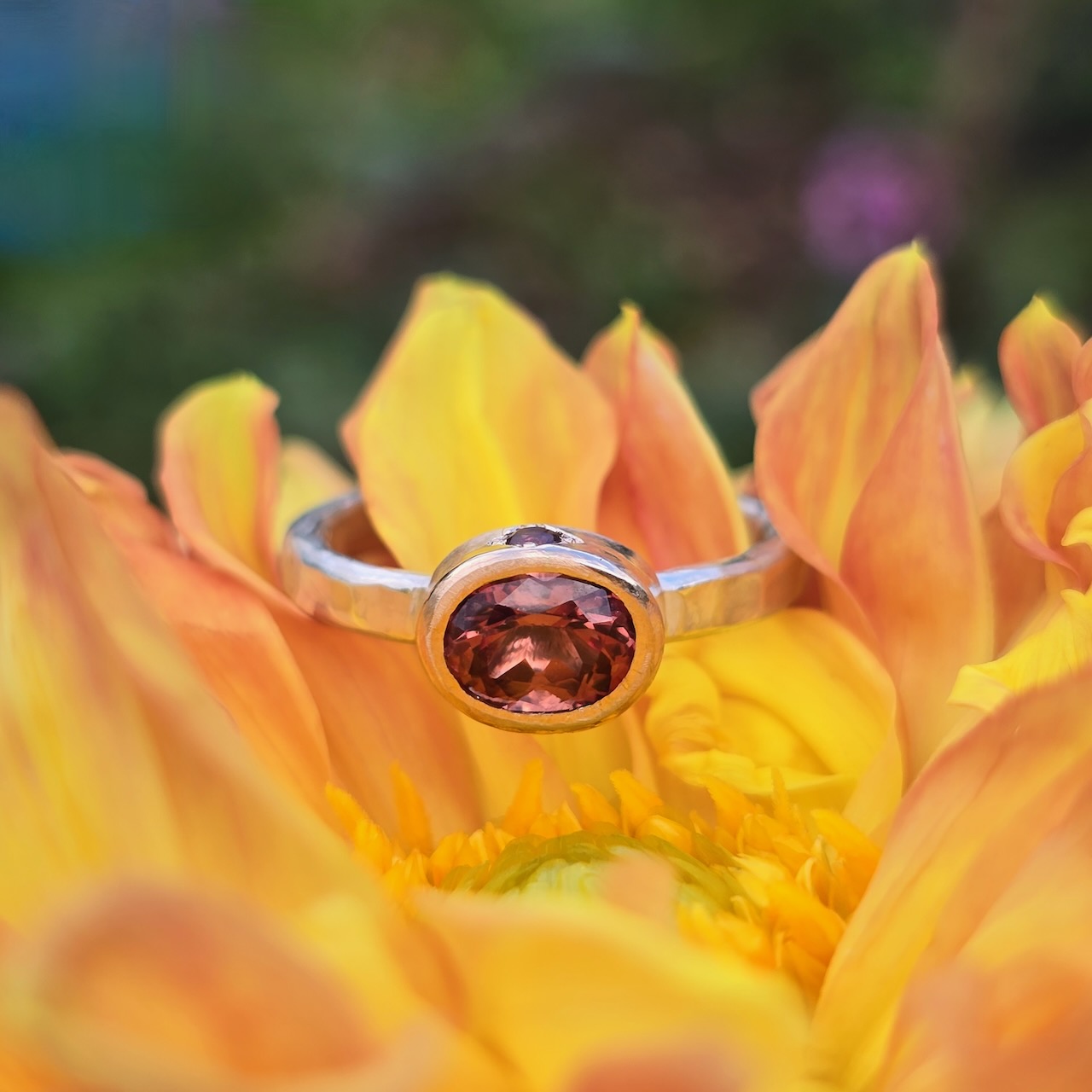 / Peach tourmaline empress ring; Songea sapphires, 9ct red gold and silver