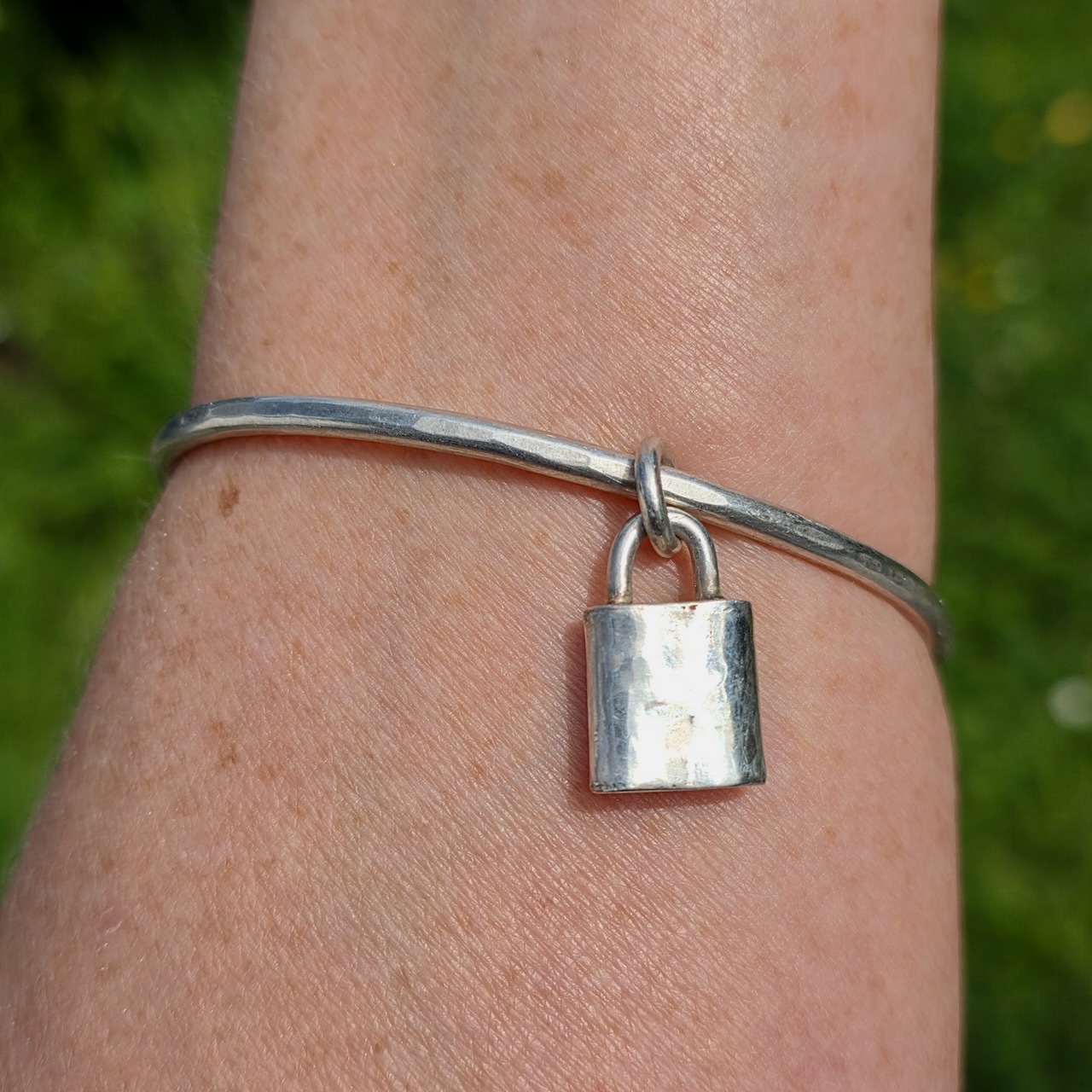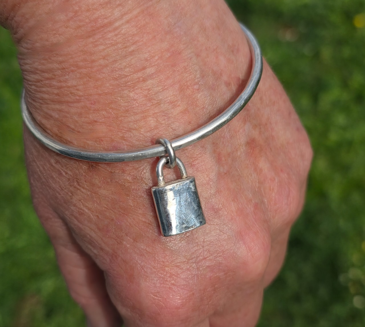 Silver padlock on 3mm silver bangle. Diameter 65.5mm, can be resized.