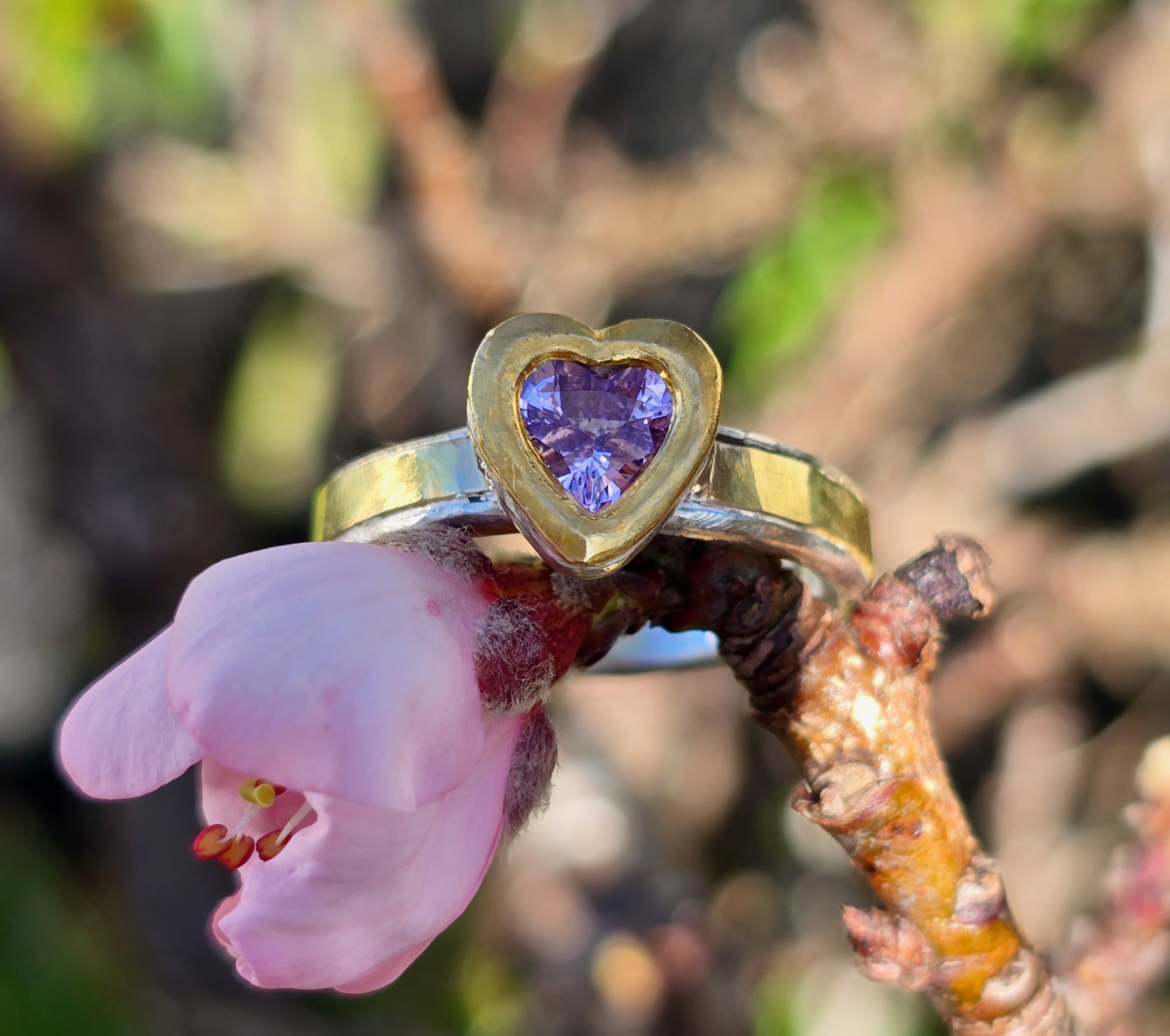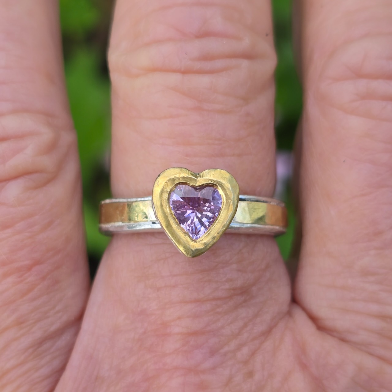 Star Struck heart ring; .82 pink sapphire, fine silver, 24ct gold. Size Q 1/2