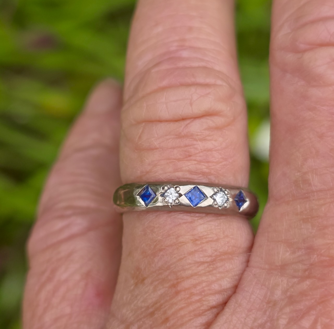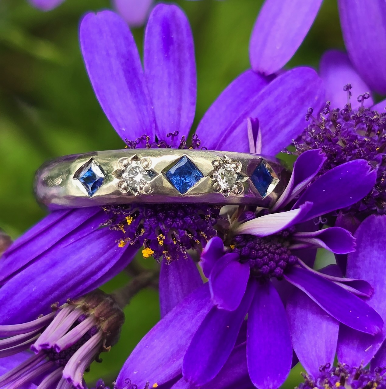 Star Struck Ring; 9ct white gold palladium mix, E SI1 diamonds, blue princess sapphires. Size O