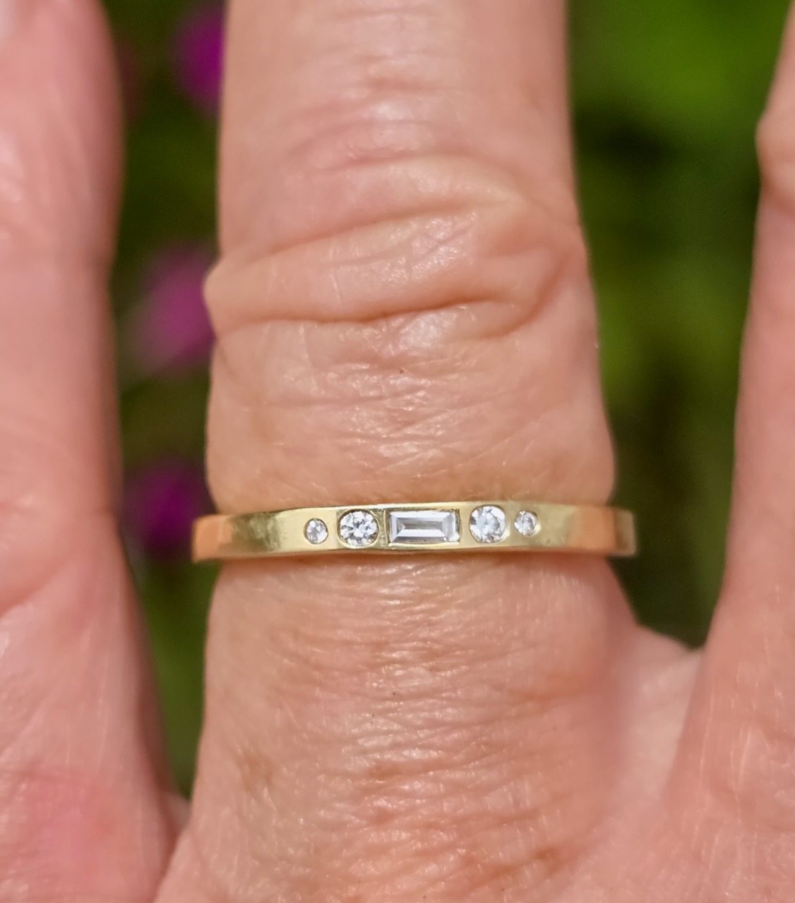 Tiara Ring; 18ct yellow gold, 1x F VS 3.1x2mm baguette, 2x 1.8mm, 1.2mm F SI diamonds. Size 0